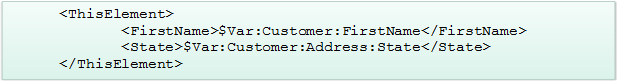 The path $Elem:State will evaluate to the string “$Var:Customer:Address:State“.