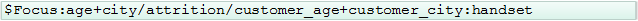 Refers to the handset field on the attrition object, related by the age and city of the customer (assume that the focus table object holds the table customer with the filter name = ‘John Smith’).