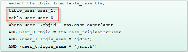 Alias must be specified when it is necessary to differentiate between two different paths to the same target object. For example, a case query for Owner = ‘jdoe’ and Originator=‘jsmith’ uses the case query properties: