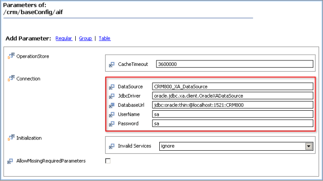 DataSource: CRM800_XA_DataSource JdbcDriver: oracle.jdbc.xa.client.OracleXADataSource DatabaseUrl: jdbc:oracle:thin:@localhost:1521:CRM800 UserName: <user name> Password: <Password>
