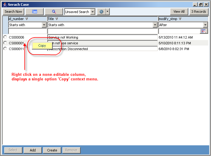 When right clicking on a none-editable column, a single option ‘Copy’ popup menu is displayed: