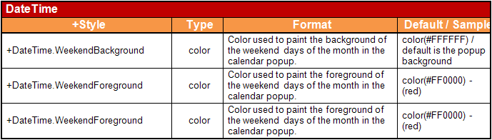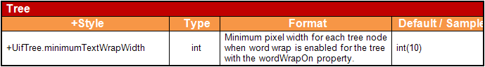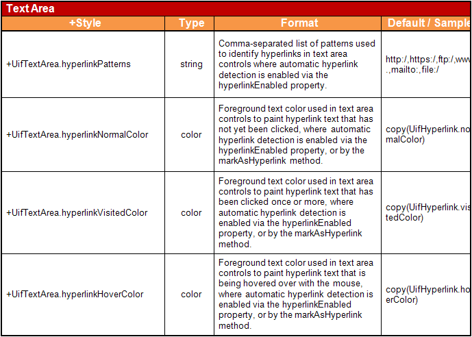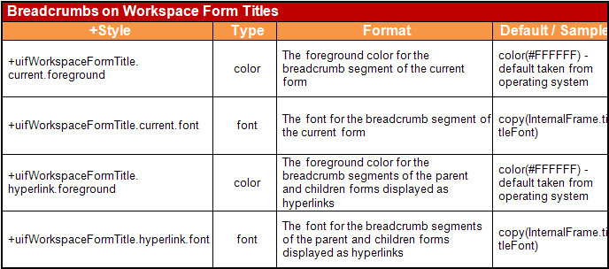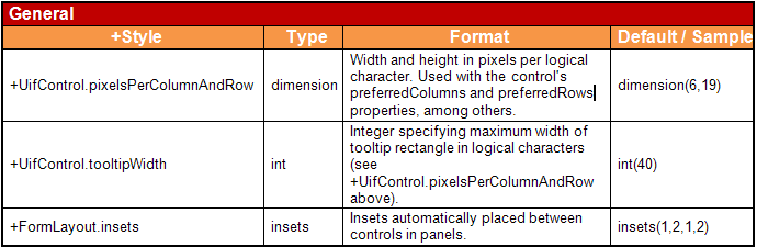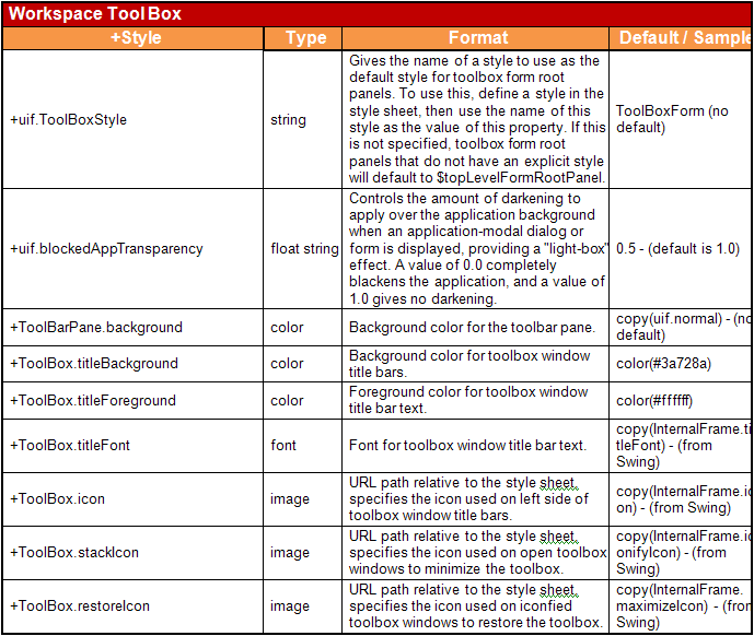 In addition to the styles described above, the style sheet allows storing name value pairs which are used to control behavior both by ASCF and by Swings’ active Look and Feel. These pairs are prefixed with a “+” sign, and the name and value are separated by an equal sign. The name-value pairs are transferred to an internal cache (Swing’s UIManager) from where ASCF and the Look and Feel system can pick up the values and consume them. This allows customization of certain aspects of the look and feel using this style sheet.