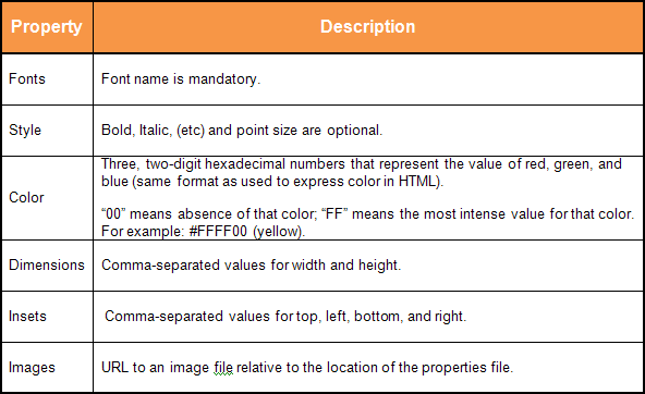 - The format for specifying the values is – <type> ( value ) – i.e., specify the type which is one of int, boolean, font, color, dimension, insets and image, followed by value enclosed between round brackets. String values should be entered as is, without any type notation