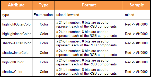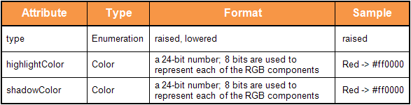 The default is lowered border if type is not specified. All of either highlightOuterColor, highlightInnerColor, shadowOuterColor and shadowInnerColor; OR highlightColor and shadowColor, should be provided to paint the border with the required colors.