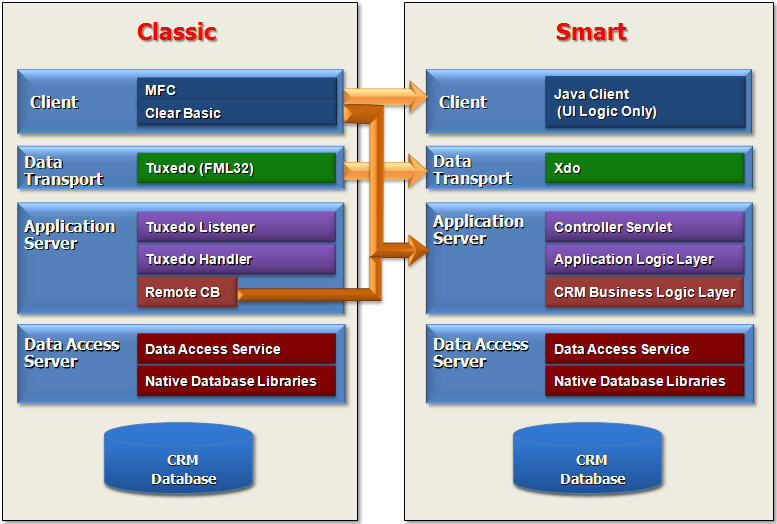 Classic client interacts with its database either directly (2 tier mode) or using the Tuxedo transaction monitor as an intermediate layer which optimize SQL queries and transactions between the client and the database (3 tier mode).