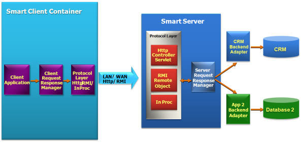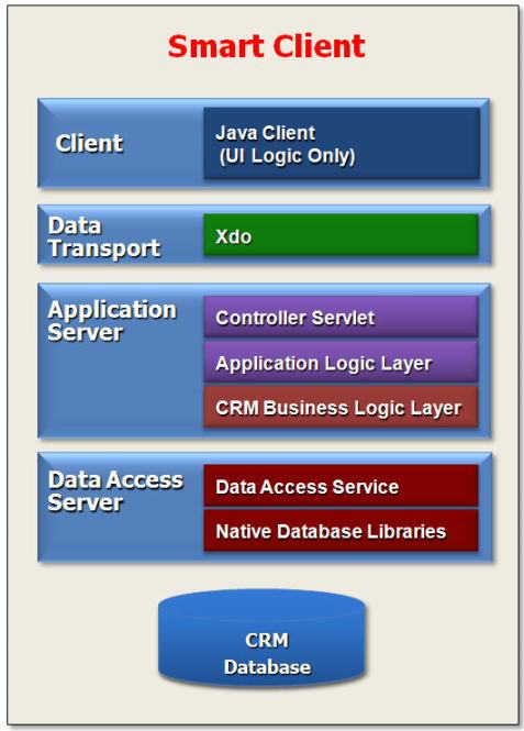 Smart Client does not access the database directly. Rather, it uses a backend application which is run by an application server (Weblogic or Websphere) to access the database. This backend application structure also known as J2EE.