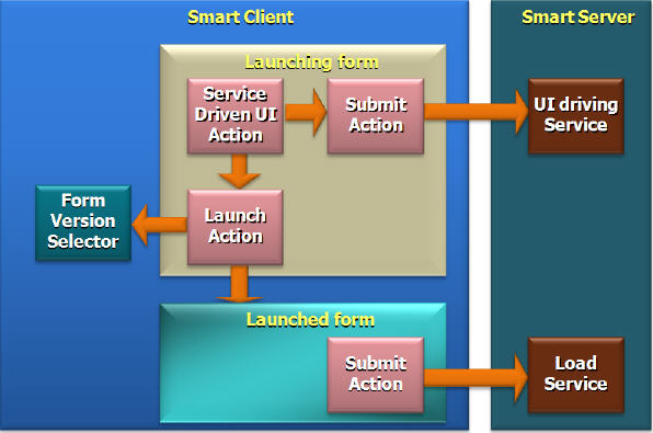 The Service Driven UI Action launches forms determined by a backend UI-driving service. It uses Submit action to execute UI-driving service. The UI-driving service determines next logical form. The launch action is used to populate the next logical form name. The launch action properties may be specified by service. The Service Driven UI Action copies input data models to the launched form’s dataset. It supports data context with contained input data models. It can accept multiple explicitly defined Launch actions (one per possible next logical form) along with a default one and it dynamically creates Launch action if needed.